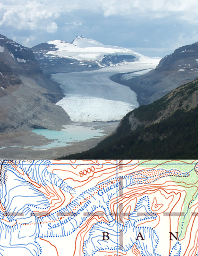 When two glaciers flow together a moraine might develop between them. This type of moraine is known as a medial moraine. The Saskatchewan glacier has a tributary glacier feeding into it with a medial moraine separating them. The brown dot pattern cutting the length of the Saskatchewan glacier in Figure 5 (Bottom) illustrates the medial moraine. This topographic map was made in 1960 and the tributary and Saskatchewan glaciers are the same length. Figure 5 (Top) shows the Saskatchewan glacier in 2001 and the tributary glacier has retreated substantially more than the main glacier. The medial moraine can be seen between the two glaciers.