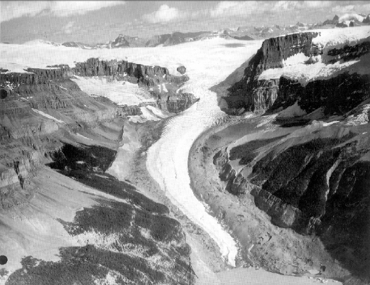 FIGURE 9: High-angle oblique aerial photograph of Saskatchewan Glacier taken Aug. 21, 1964 (U.S. Geological Survey)