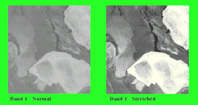 After loading the seven TM bands into the software package, the next step was to stretch each band to make full use of the absolute data range (1-250), and thereby, create more detailed images. Figure 5 demonstrates the difference between the regular recorded data and the stretched data of an image. Most of the time the dynamic range, that is the range of the recorded values, of a band does not equal the full extent of the absolute data range. The software provided the ability to display the statistics and histograms for each band. In this analysis the minimum and maximum values were used to stretch the data. For example, if a band had a minimum and maximum data value of 20 and 155, respectively, these values were converted to 1 and 250 and all of the values in between were stretched accordingly. Rather than automatically using the minimum and maximum values associated with a band, one can establish other values within the dynamic range to be used as the minimum and maximum levels for the stretching procedure, and in the process, center in on a certain portion of the data range to enhance.