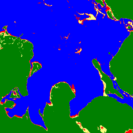 In the addition process between the new Band 4 picture and Band 5, water is pushed to the bottom of the data range and land to the top of range. The oil over the water falls somewhere in the lower section of the data range but above regular water. What was being shown as oil on the land in the previous is now grouped with the land and can be separated from the oil on the water. The density sliced ranges used on the image generated by adding the classified and stretched Band 4 image to Band 5 were: 0-8 (water, blue), 9-24 (light oil, red), 25-45 (heavy oil, yellow), and 46-250 (land, green). Table 4 and Figure 10 display the results of this third classification.