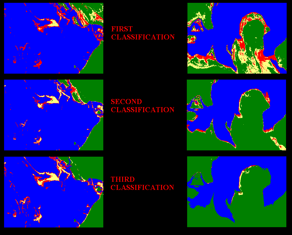 Figure 11 compares the results of three classifications within two sections of the study area. The first classification, which was based just on the stretched version of Band 5, indicates too much oil over the land with some of the supposed oil deposits being quite a distance inland. The second classification, which was produced by adding the stretched versions of both Bands 4 and 5, corrects most of this problem. However, some patches still exist and a fair amount oil is found along the coastline. Some of the oil being indicated along the coastline might be actual oil from this oil spill or an earlier spill(s). The third classification, which was created by putting together a classified and stretched image produced from Band 4 with the stretched version of Band 5, shows very little oil on the land. This classification produced the best results. One might develop a better product by changing the density sliced ranges for the four surface classes. As is often the case one is not likely to obtain a perfect classification, which is one-hundred percent accurate but one attempts to attain the best possible results.