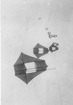 FIGURES 6a-c: Batut, his first aerial photograph taken over Labruguiere, France, and his kite with camera mounted in the middle.