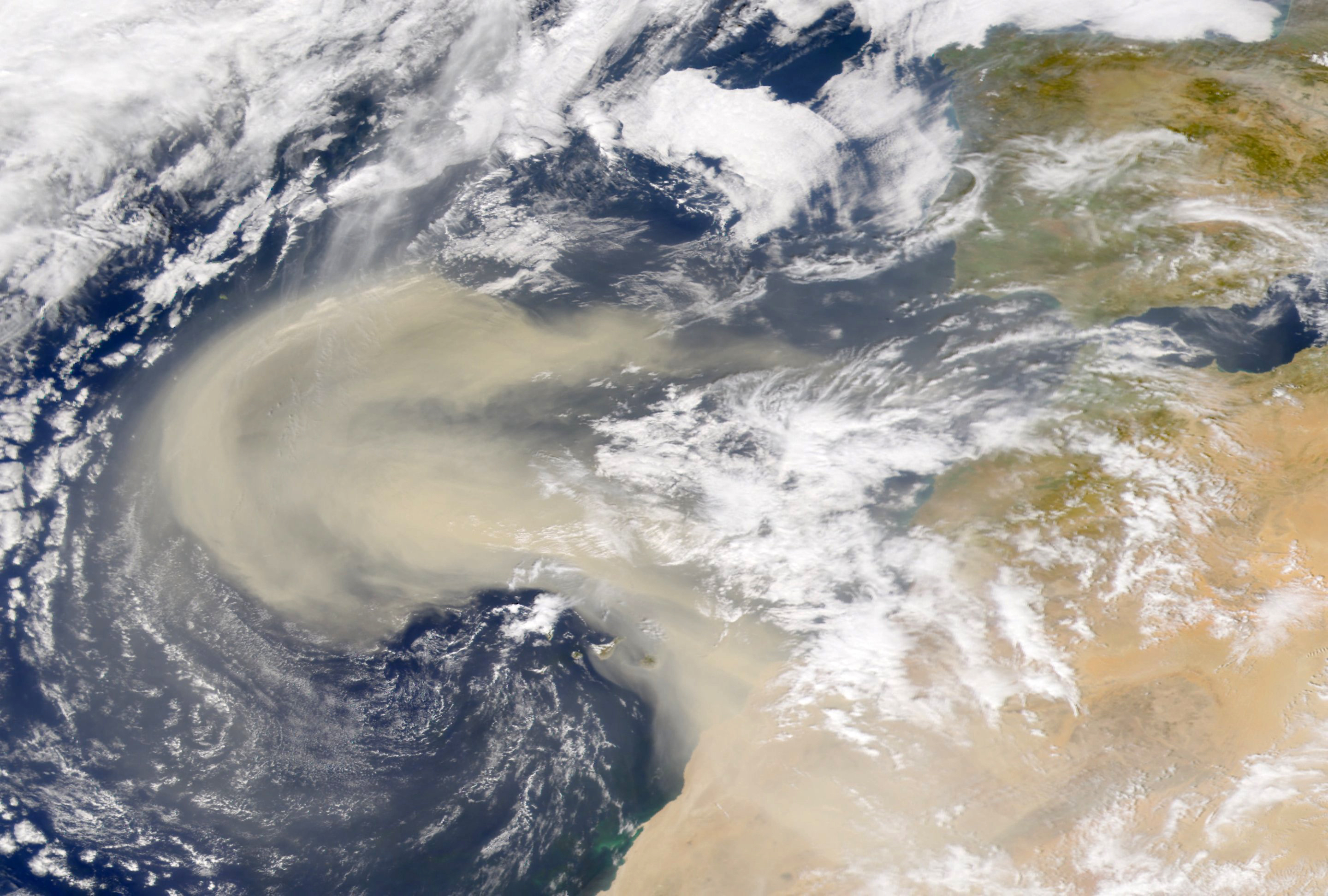 Geometric resolutions vary greatly and are defined loosely as being low, moderate, and high. The parameters associated with these designations change as finer resolutions in imagery become available. Imagery identified as being of moderate resolution at one point in time might now be low resolution. Figure 5 shows the size of a one kilometer pixel as it compares to an American football field. An image with a one kilometer pixel size is viewed as being a low resolution image. Such an image provides a synoptic coverage of the Earth’s surface. An example of a low resolution image is Figure 6, which shows a massive dust storm blowing off the northwest African desert and blanketing hundreds of thousands of square miles of the eastern Atlantic Ocean with a dense dust.