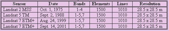 A Multiple Spectral Sensor (MSS) was available on Landsat 1, which was placed in orbit in 1972. This sensor continued to be used on the next four Landsats and recorded reflective energy in four bands of the spectrum, two visible bands and two near infrared bands. Landsats 4 and 5 launched in 1982 and 1984 had Thematic Mapper (TM) sensors that collected data in six spectral bands and one thermal band. The spectral bands covered the blue, green, and red visible and the near and mid infrared portions of the spectrum. Landsat 7 launched in 1999 had an Enhanced Thematic Mapper Plus (ETM+) sensor. This sensor had one high resolution panchromatic band that covered a wide spectral range, the same six spectral bands as the TM sensor, and two thermal bands. The TM and ETM+ spectral bands are identified as Bands 1-5 and 7. The data sets prepared for this exercise contain only the spectral bands from each sensor.