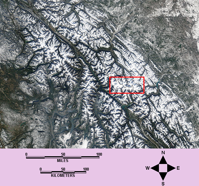 The goal of this instructional module is to measure how much certain glaciers in the Columbia Icefield have retreated over the 26 year period from 1975 to 2001. The measurements will be based on the use of four Landsat MSS, TM, and ETM+ data sets, each recorded in the late summer/early fall period. Figure 1 shows the Canadian Rockies in mid-winter with the Columbia Icefield highlighted.