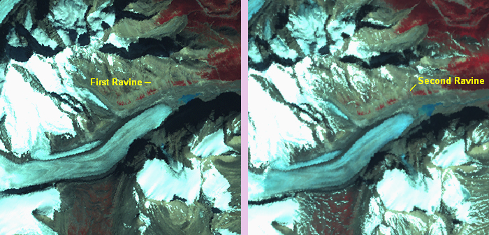 Display the false color composite for the 2001 data set. Note the various land cover and landform features along the edge of the valley. These features can be used as reference points to measure the location of the front of the glacier at different dates. It would be best to use the features on the north side of the valley since the mountains are casting shadows on the south side. Also, select features that are fixed on the landscape such as landforms; do not use features like water bodies that might vary in size. Find a feature that identifies the approximate location of the front of the glacier in 2001. For the purposes of this illustration a ravine located on the south side of the valley is used. See Figure 11 A. This feature being rather linear in nature can be continued as a line in front of the glacier. Repeat this process for the 1999 data set. In 1999 the front of the glacier is located between the ravine used with the 2001 data set and a second ravine directly to the east of the first one. See Figure 11 B.