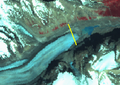 FIGURE 12: Yellow line indicates location of glacier in 2001 on the 1999 image.