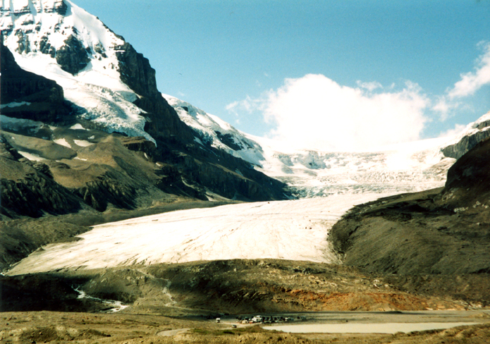 This glacier can be easily observed from Canadian Highway 93 and specialized buses take tourists out onto the glacier from the Icefield Centre. Investigations of its terminal, recessional and lateral moraines have recorded the movement of the glacier over the past few centuries. The glacier has advanced and retreated several times during this period. Historical records, maps, and photographs dating back to 1897 show that over the last 125 years the glacier has retreated about .93 miles (1.5 km). In 1870, the glacier was about 1.5 times its present total volume and 2.5 times its area. Tree-ring studies indicate that around 1715 the glacier had advanced more than any time in at least the preceding 350 years. The 1715 advancement would have the glacier’s terminus spreading across Highway 93 and reaching the Icefield Centre. Figure 6 shows the relative location of the glacier in 1960 to Highway 93. The Centre is located on the other side of the highway.