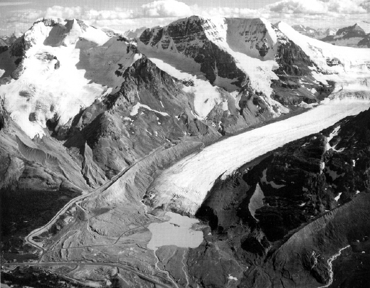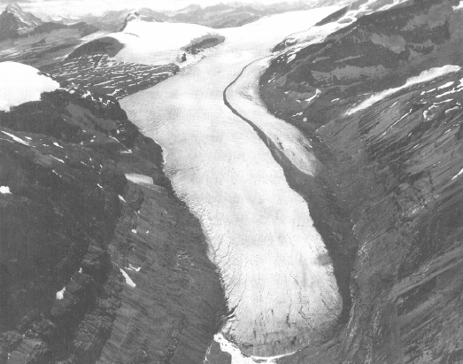 FIGURE 9: High-angle oblique aerial photograph of Saskatchewan Glacier taken Aug. 21, 1964 (U.S. Geological Survey)