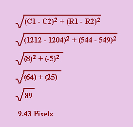Using the 1999 image record the column and row coordinates for the front of the glacier in 1999 and 2001. The approximate coordinate location in 1999 is column 1212 and row 544 and in 2001 it is column 1204 and row 549. These coordinates can vary slightly based on where one views the front of the glacier to be for the two dates. With the coordinate values one can calculate the number of pixels between the two points by using the following formula: "C1" and "C2" represent the column coordinates for the two points and "R1" and "R2" correspond to the row coordinates.