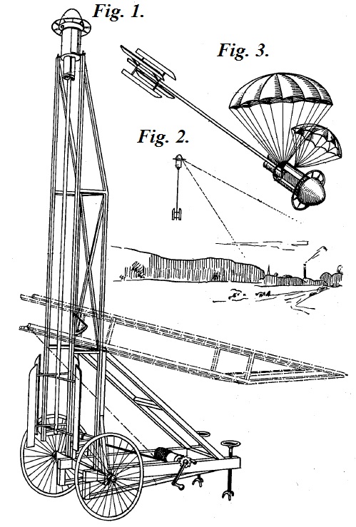 Maul’s camera was located in the hood section of the rocket and mounted at an oblique downward inclination. The lens looked through a hole in the hood. Wings or blades were provided to keep the rocket from rotating and changing direction, and thereby, maintain the focus of the lens toward the ground. At a flight’s highest point a time-fuse raised the lens’ shutter and at about the same time opened parachutes stored below the camera. The parachutes gradually lowered the rocket to the ground. Figure 12 illustrates the procedures and is modified from Maul’s 1904 U.S. patent design.