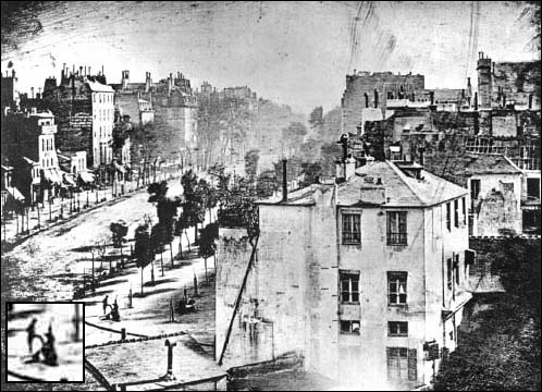 FIGURE 2: 1839 aerial photograph of a supposedly empty street in Paris, note enlargement.