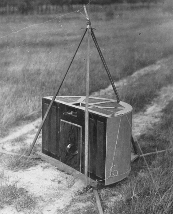 In 1903, Julius Neubranner, photography enthusiast, designed and patented a breast-mounted aerial camera for carrier pigeons (Figure 10). Weighing only 70 grams the camera took automatic exposures at 30-second intervals along the flight line flown by a pigeon. Although faster than balloons they were not always reliable in following their flight paths. The birds were introduced at the 1909 Dresden International Photographic Exhibition. Picture postcards of aerial photographs taken over the exhibition were very popular. They were used at other fairs and for military surveillance. Two sample pictures are provided below (Figure 9a-b). One can see in the one picture the tips of the bird's wings as it flew across a palace.