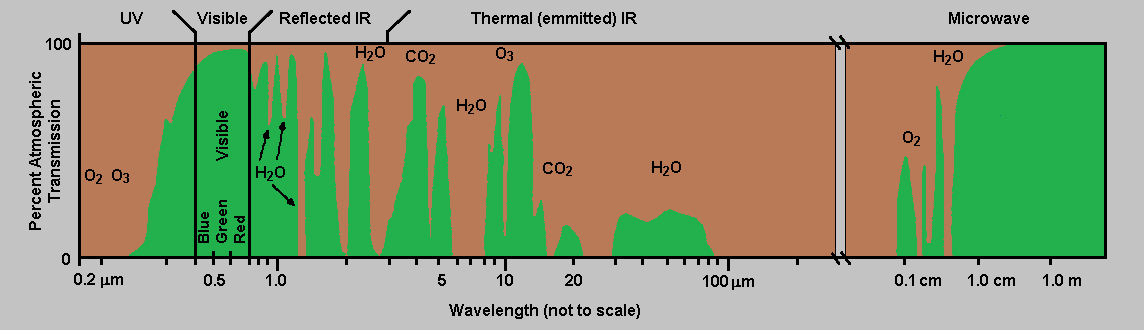 In contrast to the absorption bands, there are areas of the EM spectrum (shown in green in Figure 3 and described in Table 1) where the atmosphere is transparent (little or no absorption of energy) to specific wavelengths. These wavelength bands are known as atmospheric "windows" since they allow the energy to easily pass through the atmosphere to Earth's surface. It is in these windows that sensors are used to gather information about Earth phenomena.