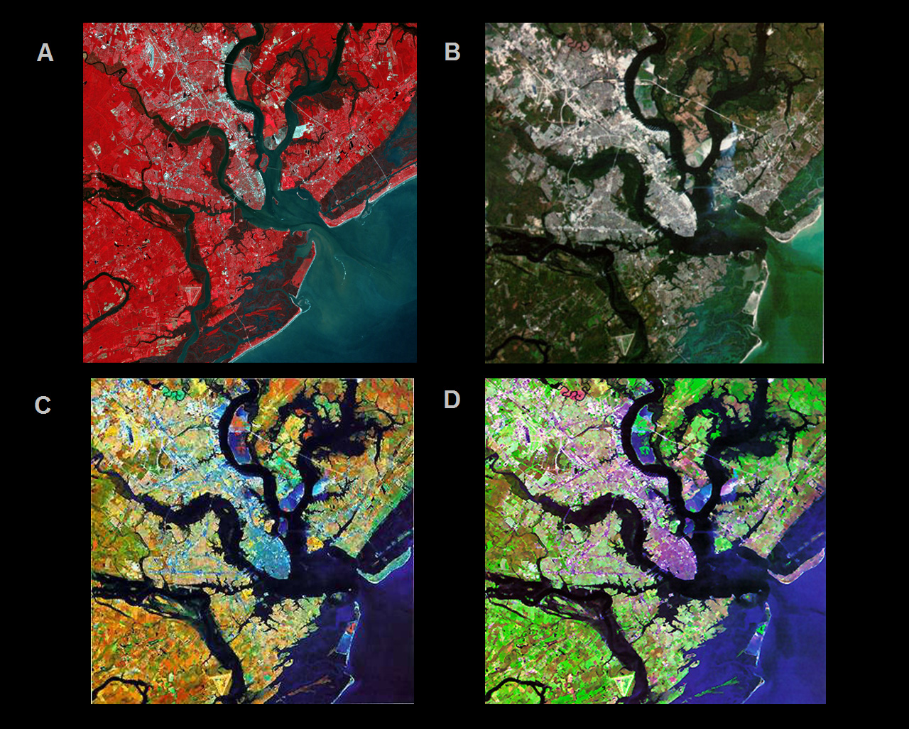 A single band image shows features in various grey tones but if several images are combined, they can form a color composite. Figure 4 B is a true color composite image of Charleston, South Carolina. A true color composite is based on using the red, green, and blue portions of the visible region of the EM spectrum. This type of composite relates to what the human eye would see if a person was on a satellite or aircraft looking down at the Earth. Other band combinations form false color composites. Figures 4 A, C, and D represent two different false color composites. A false color composite generally enhances certain features on an image, features that might not be as apparent on a true color composite. Using different color composites is one way that a remote sensing specialist detects features on the Earth.