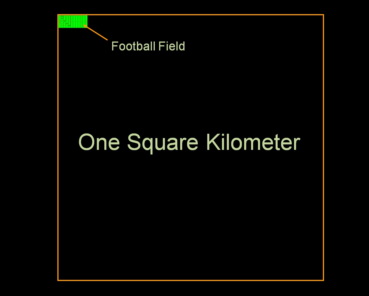 Geometric resolutions vary greatly and are defined loosely as being low, moderate, and high. The parameters associated with these designations change as finer resolutions in imagery become available. Imagery identified as being of moderate resolution at one point in time might now be low resolution. Figure 5 shows the size of a one kilometer pixel as it compares to an American football field. An image with a one kilometer pixel size is viewed as being a low resolution image. Such an image provides a synoptic coverage of the Earth’s surface. An example of a low resolution image is Figure 6, which shows a massive dust storm blowing off the northwest African desert and blanketing hundreds of thousands of square miles of the eastern Atlantic Ocean with a dense dust.