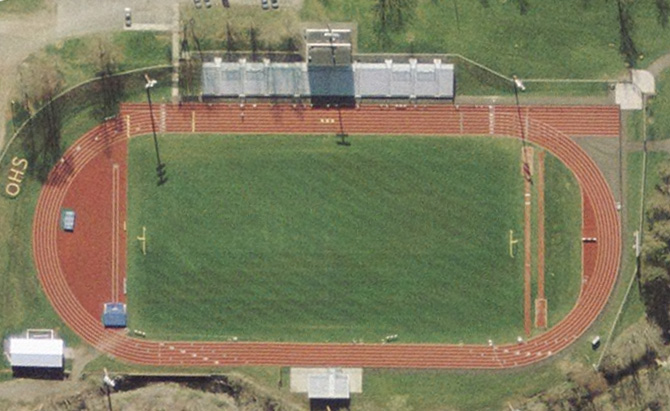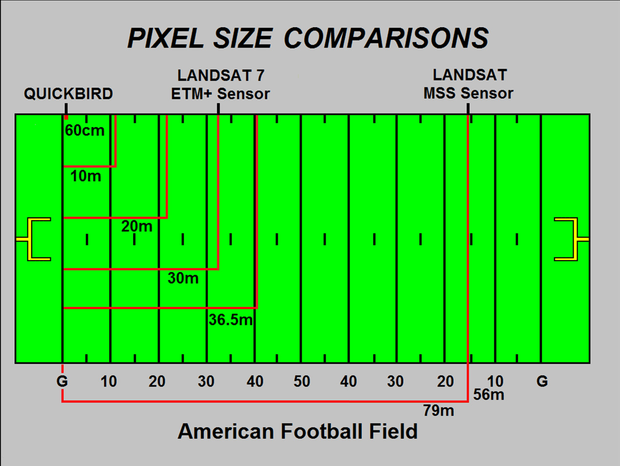 Figure 7 is a representation of an American football field that has superimposed on it several different pixel sizes. The Landsat 7 ETM+ sensor records images at a 30m resolution, which is a moderate resolution size. It would take 5.5 Landsat 7 pixels to cover the area of a football field. One would not be able to differentiate much about the field with only 5.5 pixels. The four images shown in Figure 4 are Landsat images. They provide more detailed information than the low resolution image of the desert dust storm in Figure 6 but do not cover as much area. Situated in the upper left portion of the field is a QuickBird pixel. An image with a 60cm resolution would be a high resolution image. It would take 8,361 such pixels to cover a football field. With this number of pixels one would be able to see a great amount of detail about the field. Figure 8 is a high resolution image of an actual football field. This image was acquired by a digital aerial camera and the pixel resolution is 30cm.