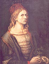 pp. 66-67: Our account thus far has assumed one thing: the Munich panel's intended function was to preserve for posterity one self that is uniquely Dürer's. A glance at the artist's earlier likenesses, however, complicates our ideas about the unity and function of the self /p. 67 in self-portraiture at 1500. Viewed in succession, these works chronicle not so much one person's physical and artistic maturation as a sequence of roles enacted by the artist for a variety of occasions. In the Louvre panel of 1493 Dürer outfits himself dutifully as lover and as husband; in the Prado portrait he appears as worldly gentilhuomo ; and in the Munich picture he is something more lofty and audacious, a being fashioned in the image of God. If we sense the person 'Dürer' behind this change of costumes, it is only in the gap between, one the one hand, the garb that fixes the sitter into his various roles and, on the other hand, the sitter's face that, remaining constant through the panels, gazes out of the picture with a conviction and an immediacy at odds with the variously clothed body. Thus in the Louvre Self-Portrait, a spruce and eager Dürer, wielding his medicine against impotence, presents himself to his fiancée. And yet the attention and flattery he lavishes on his own appearance, the strong sense we have of Dürer relishing the specular act of self-portraiture would be the artist's narcissism at odds with his role. In the Prado Panel, Dürer's familiar face peers out at the modern viewer as if somehow mocked by his own costume. This does not tell us what Dürer was "really" like, only perhaps what we how he was not like. And in the 1500 Self-Portrait, as we shall see, Dürer thematizes the unbridgeable rift between himself, in all his vanity, narcissism, and reveals himself to be mere man. My point herre is not to decipher an inner subjectivity that is constant in all Dürer's self-portrait, but rather to demonstrate how, to a modern sensibility, these works are strangely anonymous. What we think should be their subject, Dürer, emerges only negatively, at a distance from a role and therefore from the initial function of the panel.