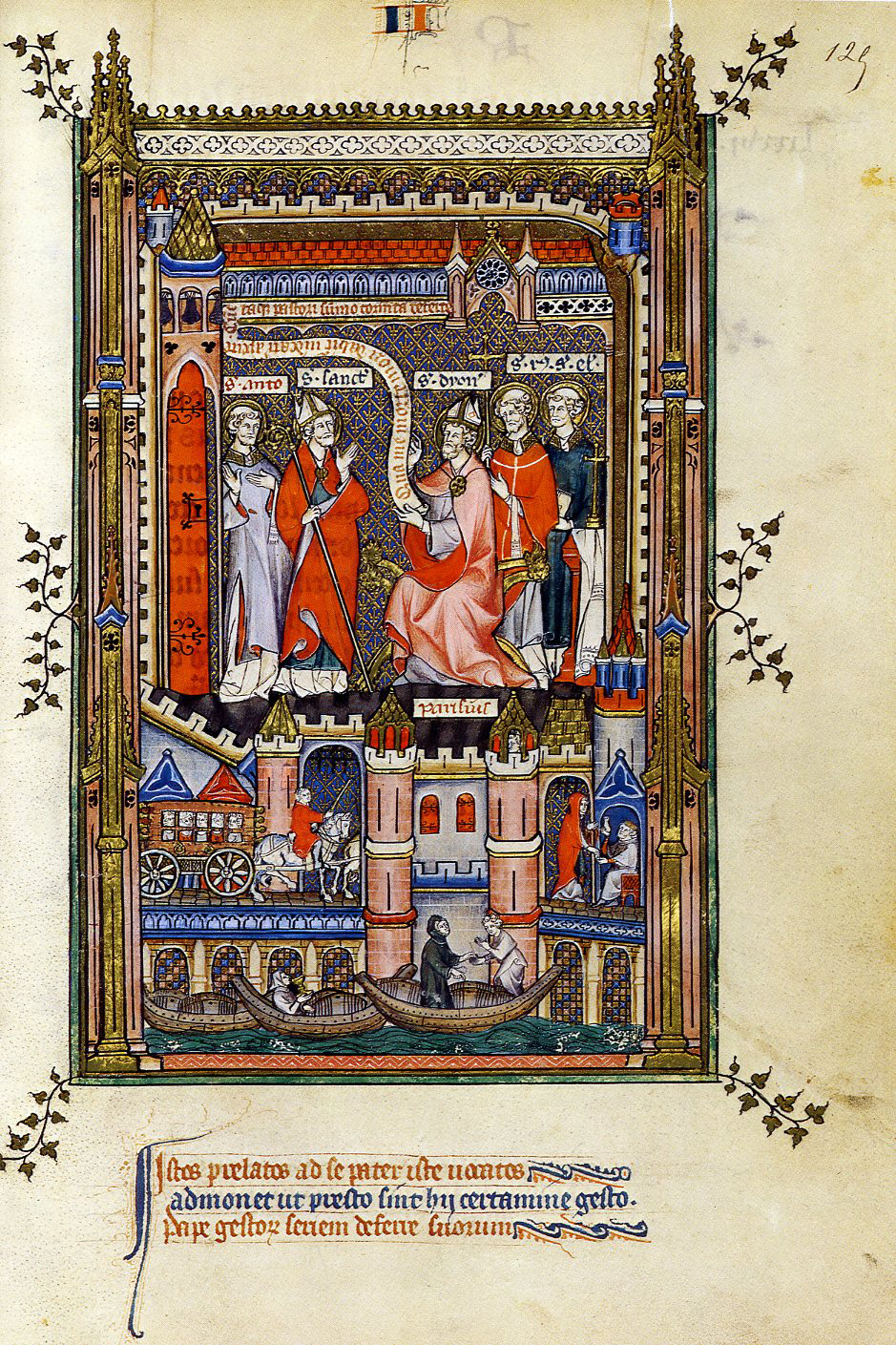 In 1317, King Philip V of France (The Tall) received from his chaplain Gilles, the abbot of Saint Denis, a luxury copy of a text entitled The Life of Saint Denis. The manuscript was begun during the reign of Philip IV (The Fair) at the command of Jean de Pontoise, Abbot of Saint Denis. The manuscript now preserved in the Bibliothèque nationale in Paris (French 2090-2092) contains seventy-seven miniatures illustrating the life and martyrdom of Saint Denis, the first Bishop of Paris and the patron saint of France.