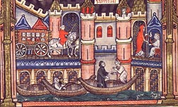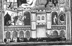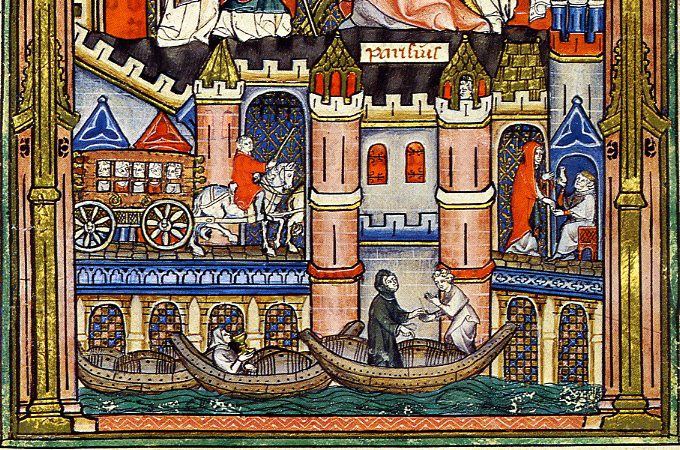 Here a group travellers arrive at the gate of the Cité. This reminds of the important role the city walls played in the social, economic, and political life of the period. On the Petit Pont, a physician inspects a urine specimen while receiving payment from a woman. The river played a vital role in the economic life of Paris. Here a wine merchant has arrived with his cargo. Regulations prohibited the unloading of cargo by anyone other than a citizen of Paris. In order to bypass this regulation, the wine merchant sells a cask while another Parisian samples the wine in an adjoining boat.
