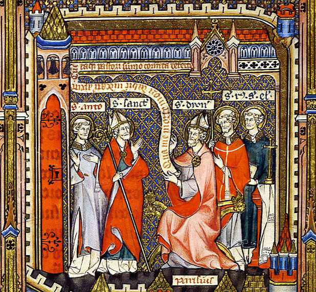 Hierarchic scaling, miter, central position, and X-shaped throne establish the authority of Saint Denis. His pointing gesture along with the banderoll he holds clearly establish him as the active speaker or authority while St Saintin's open palm gesture establishes his role as listener.