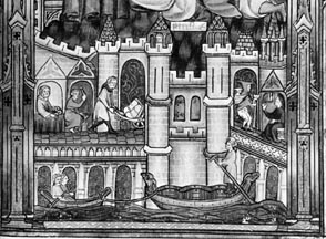 On the Grand Pont appears a money-changer and a goldsmith. There was not a national currency during this period so that the money-changer played an important role during this period. A watchman peers out from his tower guarding the gate to the Ile while a porter pushes his wheel-barrow loaded with bales. On the Petit Pont a beggar. carrying a small baby, receives alms from a woman cutler seated at the door of her shop with her wears prominently displayed on the wall behind. This detail reminds us of the important role played in medieval economic life. Either as the support of a husband in the home based workshop or as an independent practioner, women played a vital role in medieval industry.