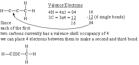 In this case there are 32 valence electrons; 10 from the 10 hydrogens, 16 from the 4 carbons, and 6 from th e oxygen. Twenty-eight of the 32 are accounted for by the 14 single bonds. Since all the carbons have a valence-shell occupancy of 8 at this point, no more bonds can be formed. Consequently, the remaining four electrons are accommodated on the oxygen, unshared.