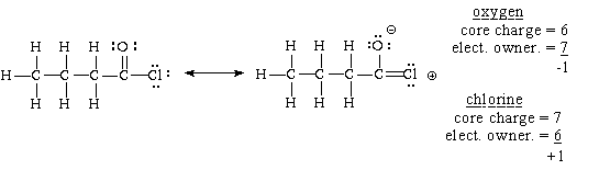 Alternatively, if we accommodate two of the remaining 12 valence electrons between the chlorine and carbon to which it is attached, forming a second bond there, then 4 electrons can reside, unshared, on the chlorine, and six, unshared, on the oxygen. This takes care of all 12. The calculations of formal charge for the oxygen and chlorin e in the structure on the right are shown below.