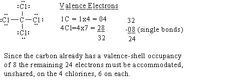If we accommodate two of the remaining 12 valence electrons between the oxygen and carbon to which it is attached, forming a second bo nd there, then 4 electrons can reside, unshared, on the oxygen, and six, unshared, on the chlorine. This takes care of all 12.